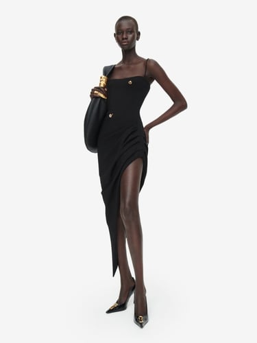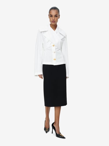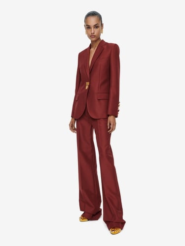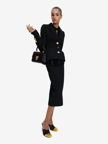Ease of movement meets whimsical fantasy, as elongated evening lines engage in dialogue with cowboy trousers and iconic sculpted jackets, each enhanced by Schiaparelli’s signature gold bijoux buttons.