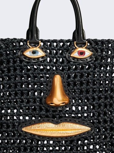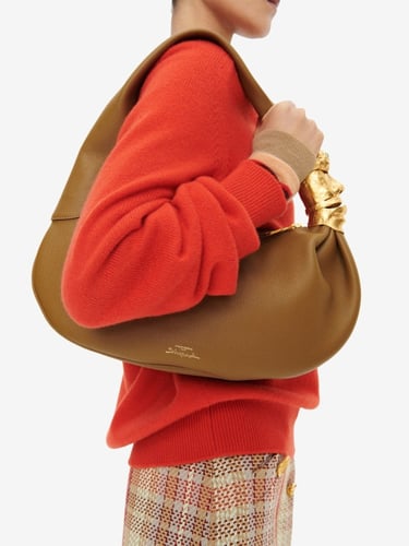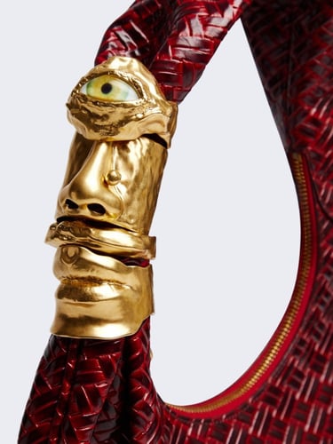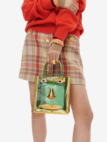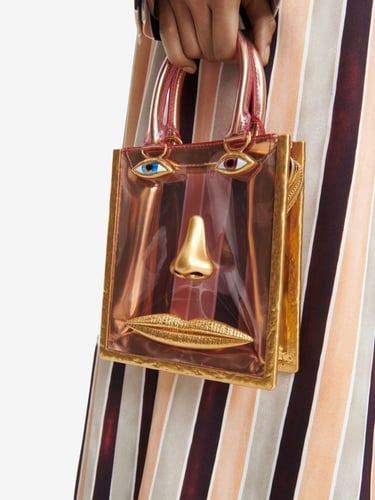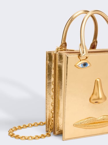 This season, novelty also unfolds through accessories, where illusion and craftsmanship intertwine. The Soufflé is reimagined in a baguette format, while the Face bag appears in soft leather with unexpected proportions, alongside a version rendered in pastel-hued vinyl. Completing the selection, the Hand-in-Hand clutch plays with scale and tactility, reinforcing the collection’s exploration of form, material, and visual surprise.