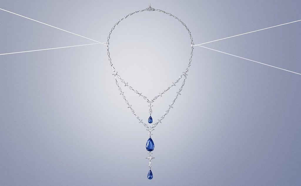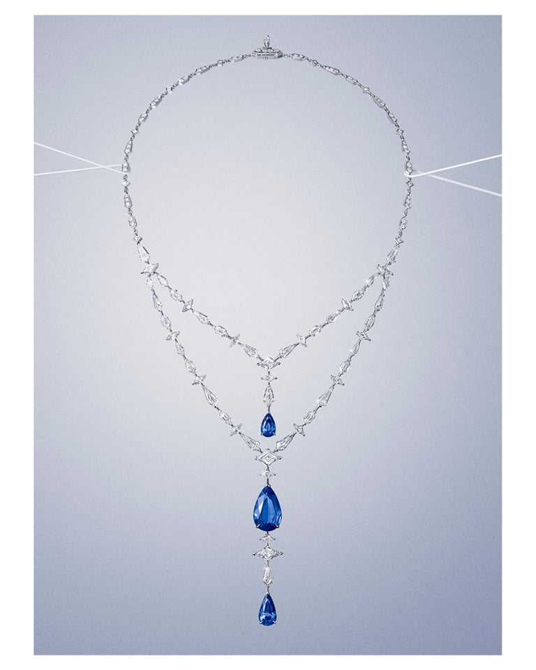 The three blue drops converge on intense diamond strands, whose variety of cuts – kite, diamond and brilliant – infuse the design with rhythm and structure.