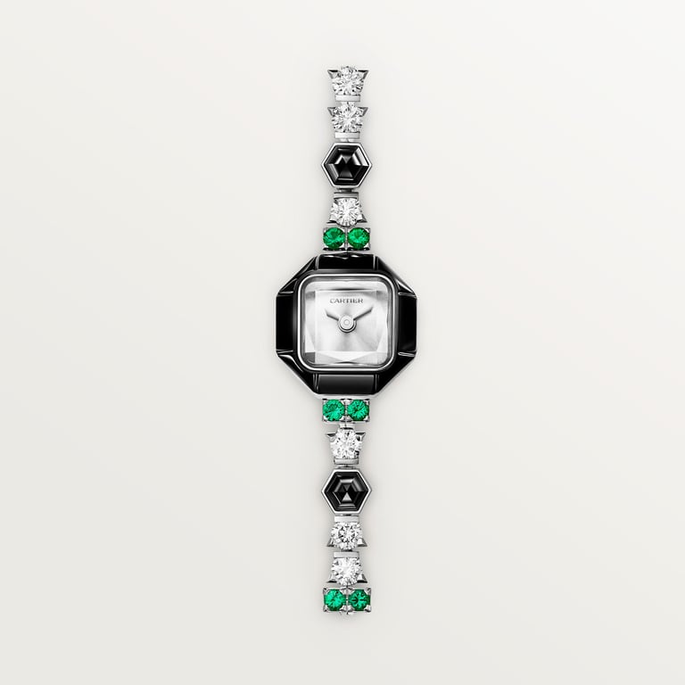 Taking its creative exploration even further, Cartier chose to combine this delicate shape with black and green, a chromatic duo emblematic of the Maison, through the emerald and onyx. Combined with diamonds, this combination has been an integral part of the Maison's vocabulary since the beginning of the 20th century. Alluding to the Art Deco movement, craftsmen use it to bring relief, depth and a touch of modern sophistication. On this watch, Cartier's craftsmen have adjusted and faceted the onyx in order to dress the bezel. The dark yet luminous intensity of this material reinforces the contrast with the silvered finish of the dial and its radiating effect.