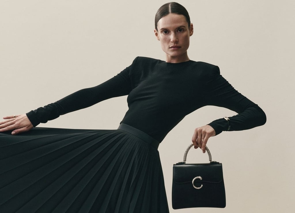 Cartier introduces the new Panthère C de Cartier Small Model Handlebag in black grained calfskin, adorned with softly curved metal rings.