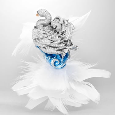 The swan is secured to the wrist with a satin strap, festooned with white feathers, completed by a feather-shaped pin buckle crafted in 18-carat ethical white gold.
