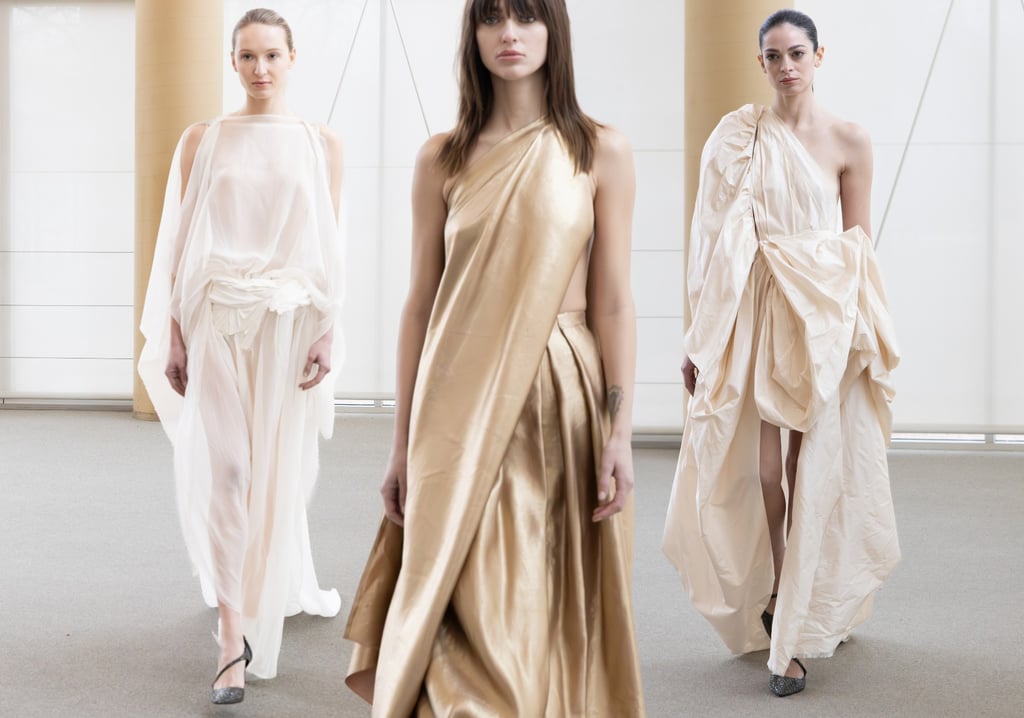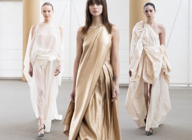 AELIS's creations are inspired by three iconic works: the Venus de Milo, the Winged Victory of Samothrace, and Myron's Athena. Sofia chose to reproduce the statues' original drapery, incorporating it into the dresses.