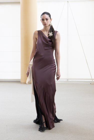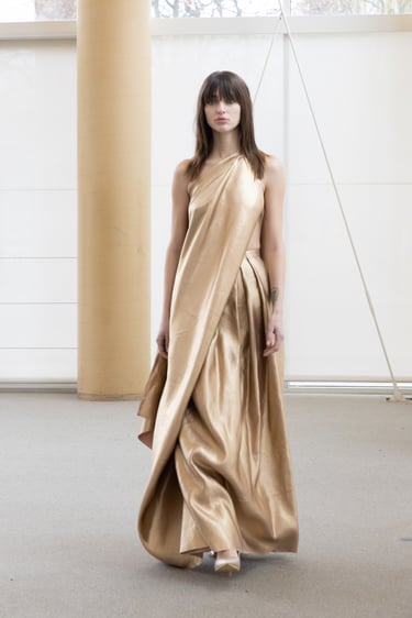 Statue fragments that become dresses draped in silk: this is the starting point of the research AELIS undertakes in this new collection. Sofia Crociani, invited during a visit to the "Ateliers d'Art du Grand Palais – RMN," discovered the beauty of the "Atelier de Moulage," founded by the Louvre Museum in 1794. Following the path traced by the Greco-Roman culture that inspires and nourishes AELIS's aesthetic, Sofia collaborates with "les Ateliers d'art du Grand Palais -RMN to create dresses inspired by classical statuary, focusing on the draping of these works.