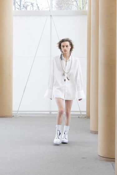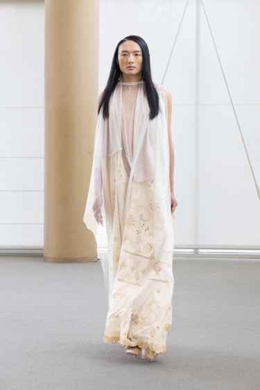 The combination of plaster and natural silk creates a striking trompe-l'oeil effect, blurring the line between statue and dress as they move on the body. The fragments of the plaster statues' drapery embrace contemporary, intangible natural silk fabrics gots certified that blend with the plaster.