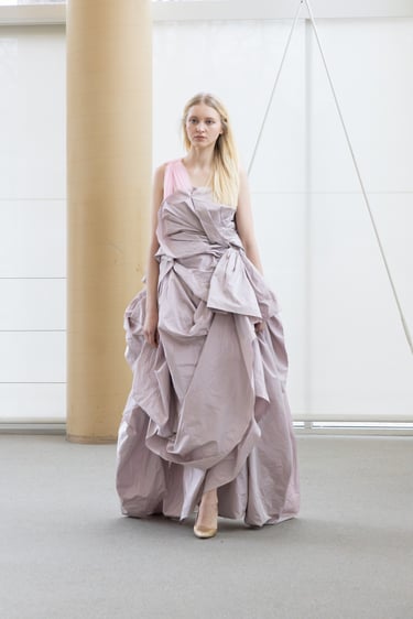 Pastel-colored dresses in bio silk taffeta, inspired by the paintings of early Renaissance Beato Angelico, evoke the shape of sculpted marble, creating volumes that elude the weight of the material. Metallic tones of gold and silver complement the collection, lending a precious feel. An antic early 20th-century tunic in gold and silk laminate lace creates the evanescent silhouette of a white tulle skirt.