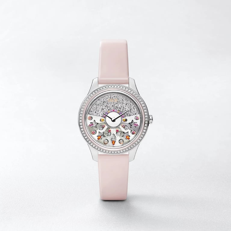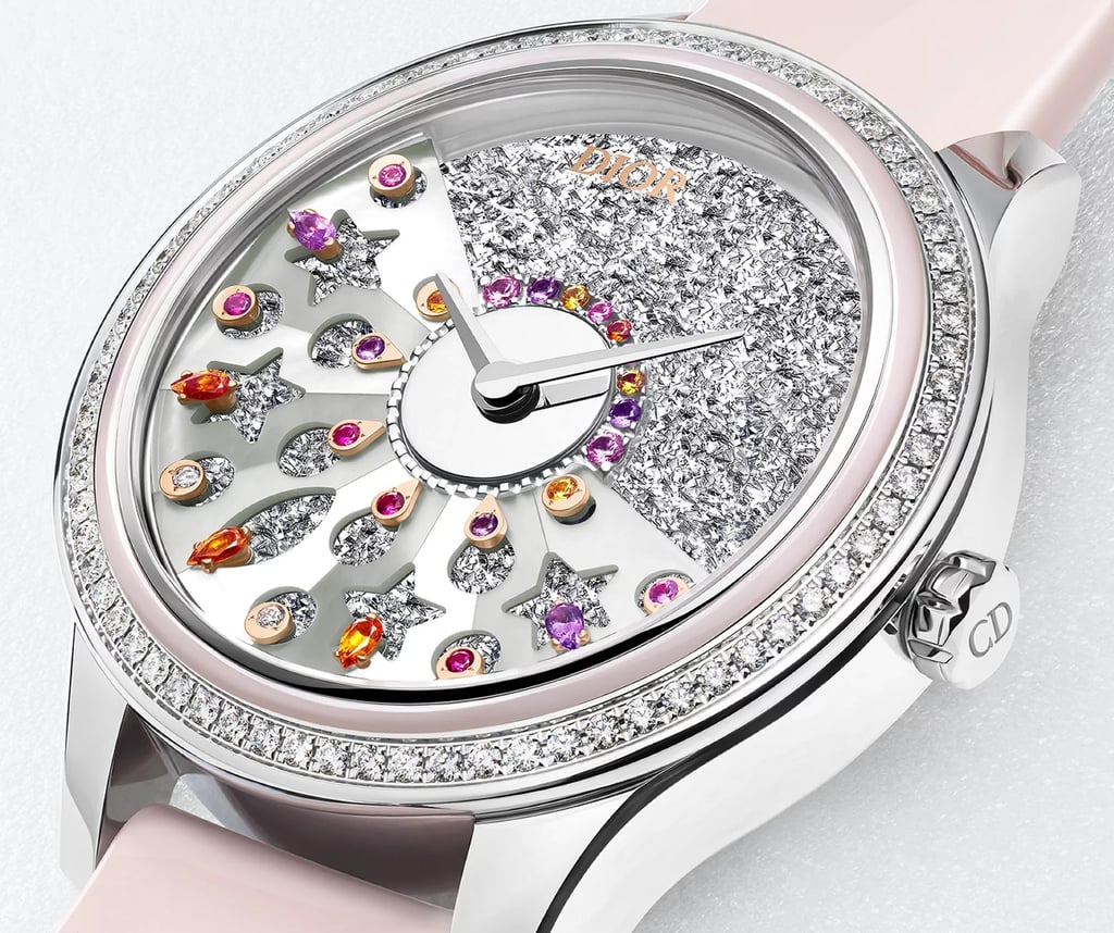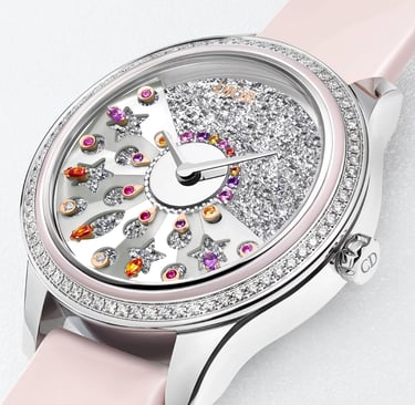 Here, technical watchmaking innovation meets femininity. Refined materials and a kaleidoscope of colors evoke the magical balls so cherished by Mr. Dior, inviting the wearer to glide gracefully across the dance floor.
