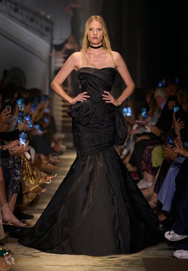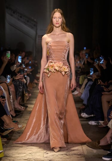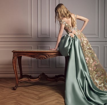Fusing opulence with attitude, the collection reimagines glamour through sculptural silhouettes and sensual detailing. In this realm of volumes and velvet excess, French corsetterie is reborn as a bold whisper of seduction—an intimate embrace of elegance and strength. Whether ribbed with ebony velvet, sculpted into metallic masterpieces, or paired with flirtatious cascades of lace, these showstopping corsets celebrate the body with a wink of seduction. Unexpected volumes add drama and movement to moiré sheaths—draped to reveal a flash of skin or cinch the waist with theatrical flair. A palette of macaron hues— nude, rose pink, water blue, and mint—contrasts with imperial black and gold. Floral bouquets bloom boldly across both print and brocade, infusing the collection with romantic vibrancy.