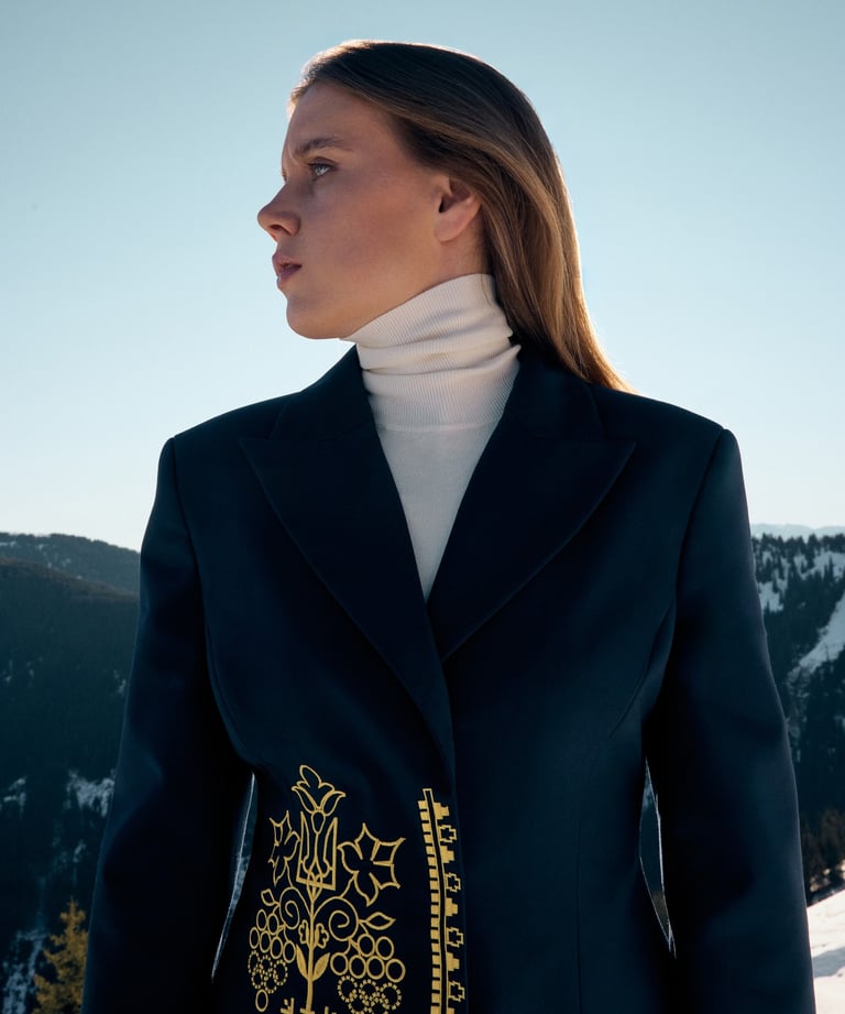 The new ceremonial looks preserve the recognizable DNA of Gasanova — clean lines, powerful silhouettes, and meticulous attention to detail. The suits are executed in a restrained, graphic aesthetic: deep navy architectural silhouettes are enhanced with gold embroidery based on stylized Ukrainian ornaments.