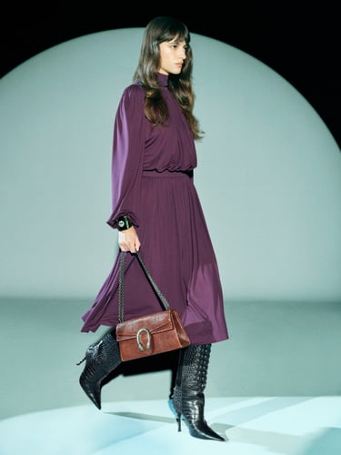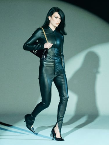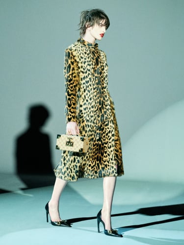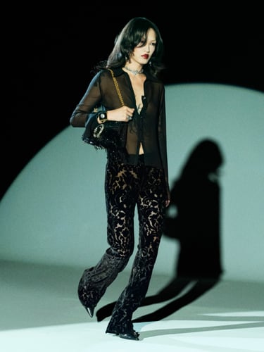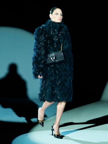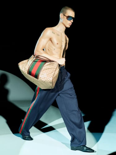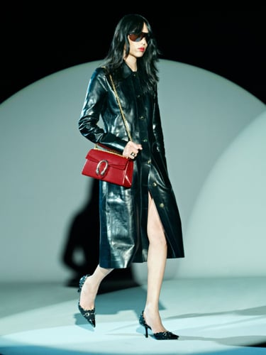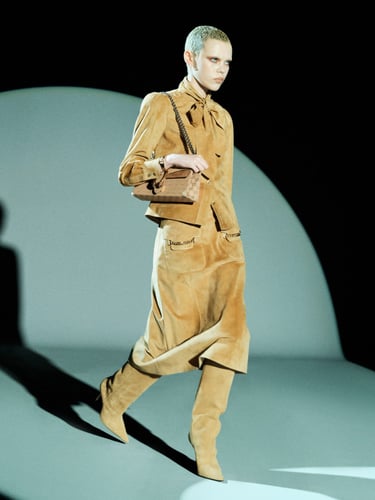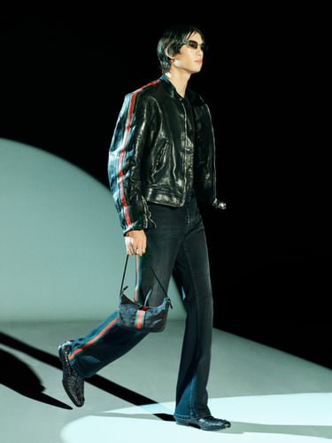 Reimagining 70s and 90s House signatures, racer jackets feature a Web stripe and belts debut a sliced interpretation of the iconic Double G buckle, alongside head-to-toe leather and suede looks, and equestrian-print silk ensembles inspired by archival silk scarves.