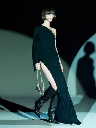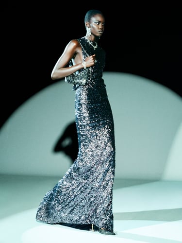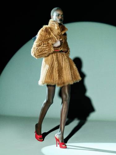 Textured coats have the lightness and ease of a peignoir, cut from strips and pieces of shearling with silk, goat hair, and feathers, linked in intricate patterns atop sheer bases and linings. A party wardrobe is made up of underwear-inspired garments worn with silk blousons, draped miniskirts with matching tops, and minimal gowns in fluid jersey and silk chiffon.
