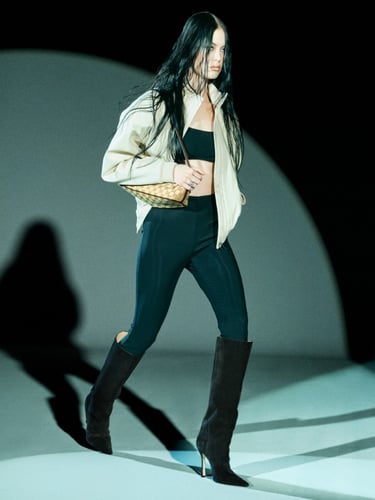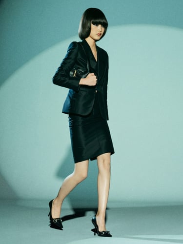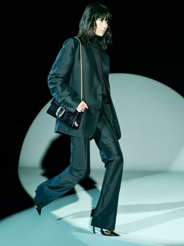 The looks open with lightweight tailoring in an archival silk faille, woven to simulate an aged handfeel. Foregoing buttons, sartorial womenswear fastens with minimal clasps: 2-piece suits with legging-fit pants and the ultimate Gucci pencil skirt. Minimal jeans feature a seamless construction, invisible pockets, and concealed closures. Refined travel suits in silk offer the comfort of pyjamas, while surfer wetsuits inform the lines of a technical mockneck and a bodycon leather jacket.