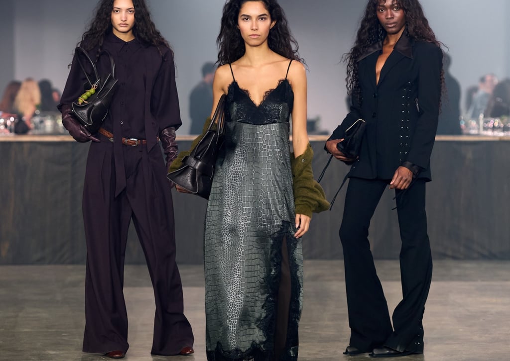Elegant, expensive pieces are styled against the raw: a fur coat worn with a t-shirt, a sheer top paired with denim. Rich and trashy exist side by side, constantly balancing one another. The colour palette is similarly inspired by the interior of a New York bar at night. Deep reds, browns, and greens echo dark leather seating, velvet drapes, and rich wooden walls. A sharp olive green cuts through, inspired by an extra-dirty martini.