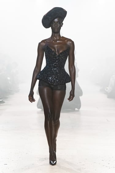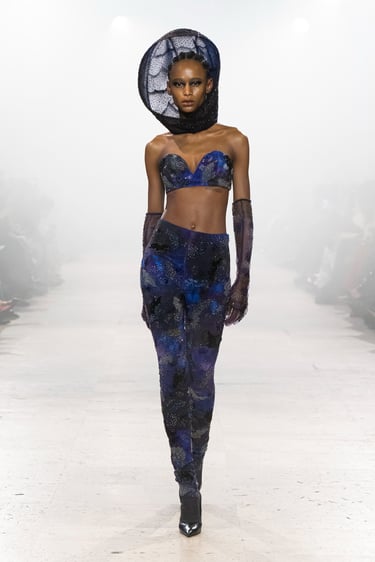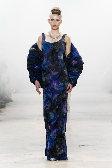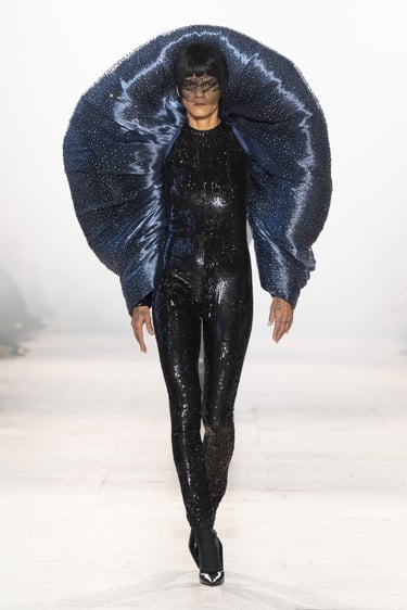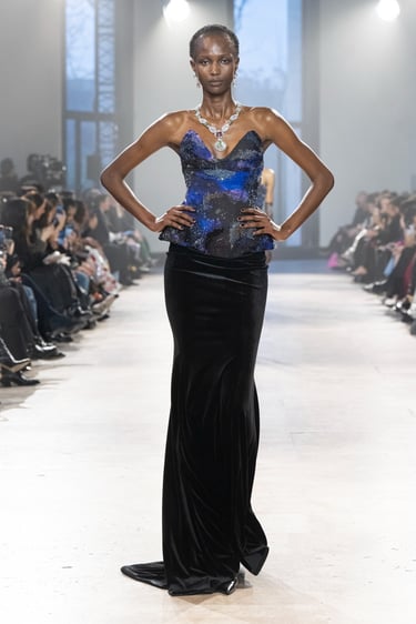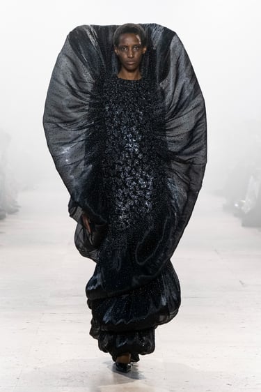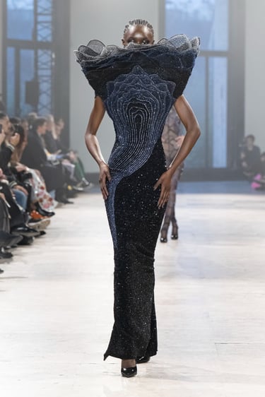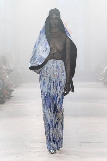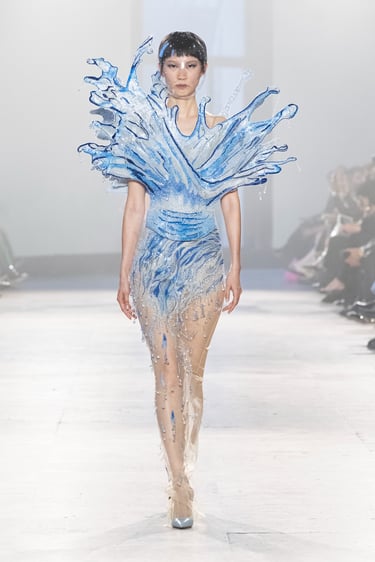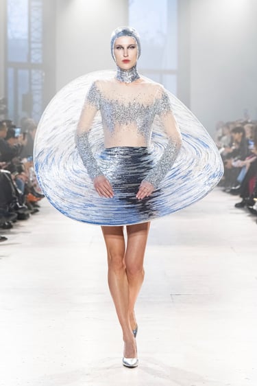 Alchemy, reflects on the transience of these foundational life forms, interpreting them as they are felt, not seen. A pilgrimage in couture, seeking sensation and feeling. It begins at the ether (akasha), the cosmic vastness, the eternal silence; which is not nothingness, but intelligible potential. The impression of air (vayu), its lightness, movement and enormous strength, traced into fabric through instinct and memory. Fire (agni) is the transformational force, like a contemplation. Shapeless by nature, but gives form to anything it touches. Water, (apas) obedient to gravity yet constantly in motion, a mirror to the moon and the world around it, yet humbly adapting to each vessel it inhabits. And Earth, the eternity’s ledger of memories. Shaped from the interactions between the other forms, it is a vessel retaining their traces and textures, the force of resilience and tenderness.