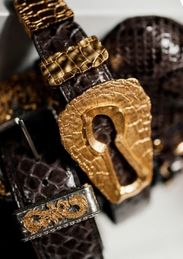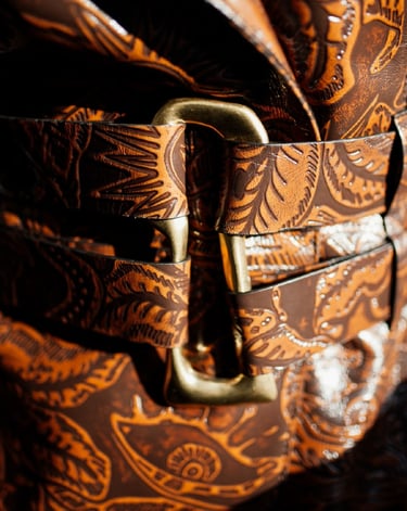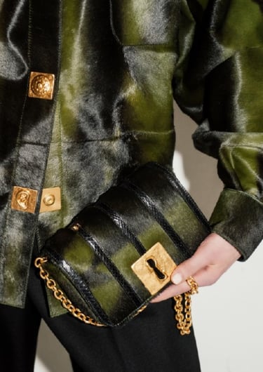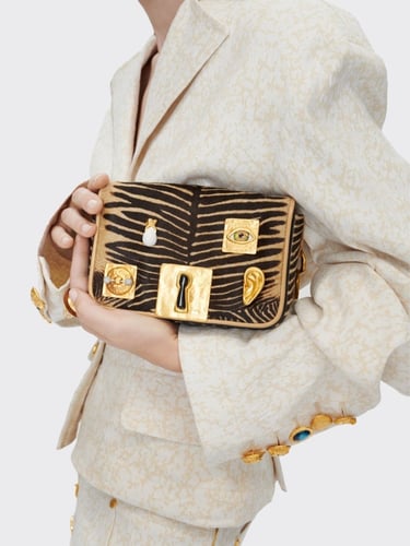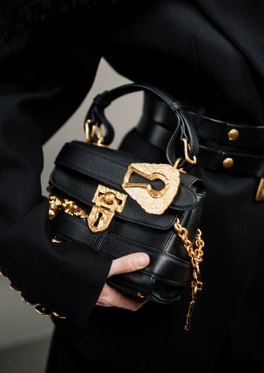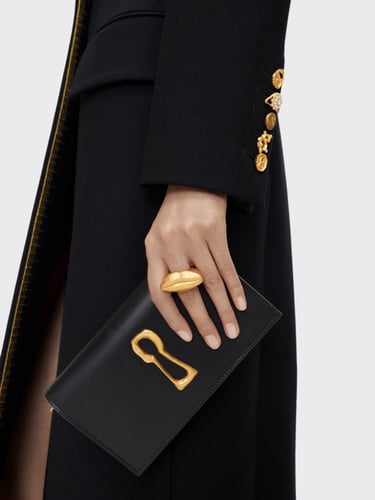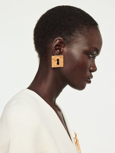 A symbol of allure and one of Schiaparelli's most storied codes, the Keyhole runs through Lone Star like a hidden constellation. The Keyhole makes its presence known in countless forms, each interpretation offering a fresh expression of Schiaparelli’s audacious spirit. It appears in hammered-brass clasps on the sculptural Schiap bag, transforming functional hardware into a small work of art. It gleams on gilded buttons, adding dramatic definition to sharply tailored jackets. It reemerges in sensual jersey drapes and surreal knitted details that echo the house’s love of visual illusion. Even pointed pumps - elegant yet daring - carry the motif as a final signature flourish.