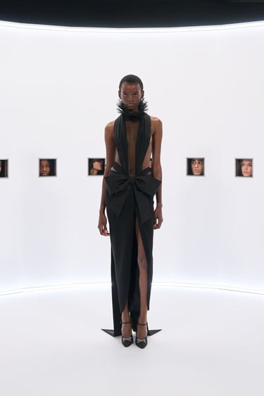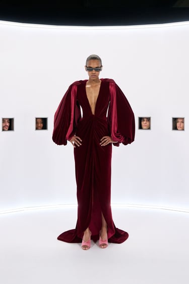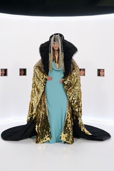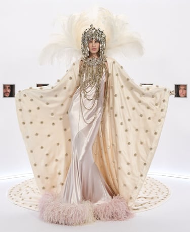 Within such a device, cinema is not evoked as a technology of the image, rather as a mythological repository, a factory of icons, sublimated bodies and apparitions that become objects of veneration. A living archive of figures and gestures that keep acting in the becoming of history. In Hollywood, divinities had very recognizable postures, gazes, silhouettes. They dwelled in distance, light, excess. They were presences withdrawn from the ordinary, entrusted to a form of secular worship. Specula Mundi’s garments enroll in such mythopoietic continuity. Not as tributes or references, but as new incarnations. Haute Couture here becomes the altar where the myth transmutes once again into body, matter, fabric.